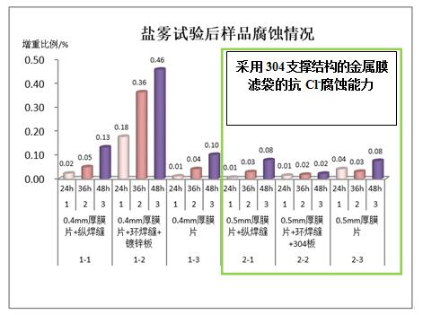 除此之外,焚烧城市生活垃圾所产生的烟气,会因为垃圾组成、燃烧方式以及烟气处理设备的不同而产生较大差异。焚烧垃圾时除产生SOx、NOx和粉尘外,还会产生HCl、HF。因此烟气净化工艺中对滤材的选择要重点考虑能够在高温酸性气氛中长期使用能力。通过盐雾试验,我们可以看出,在1% 氯离子浓度下,采用304支撑结构的金属膜滤袋表现出来优异的抗腐蚀能力。