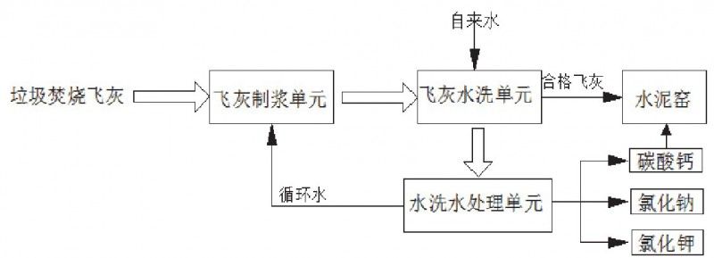 在实施工程上,水洗单元主要是采用多级逆流水洗涤飞灰中的氯,采用最经济的水灰比溶解出飞灰中的氯。此时,飞灰中的氯、钠、钾、钙及微量重金属会进入到洗涤水里。《污水排入城镇下水道水质标准》(GB/T31962-2015)中严格控制进入下水道中氯化物含量,因而,飞灰水洗废水必须经过水处理去除氯化物。水洗水处理单元主要是通过预处理去除水体中杂质后,其中碳酸钙沉淀进入水泥窑,预处理后的水通过蒸发结晶提取其中的氯化钠和氯化钾,再经蒸汽冷凝后循环利用。
