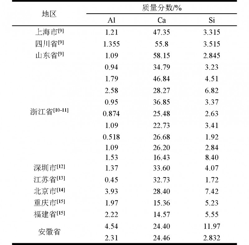 统计文献和本实验分析数据见表1。垃圾焚烧飞灰中富含有铝、钙、硅,其中钙含量最为丰富,最高可达到40%以上,一般含量为20%~40%之间。硅含量基本上达到2%以上,铝含量在1%左右。
