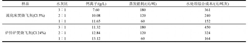 水灰比对于钙离子溶出影响比较大,由于飞灰中钙含量非常高,在不同水灰比条件下,钙离子在水中的溶解基本上是饱和的。因此,水灰比越高,钙的溶出总量越大,去除钙所消耗的碳酸钠用量越大。同时,单位飞灰水洗所需要的水量越小,回收氯化钠和氯化钾的蒸发结晶单元所需要的能耗越少。对于氯含量5%飞灰,水灰比3︰1的处理成本高出水灰比1︰1大约210元/吨灰。对于氯含量24%飞灰,水灰比3︰1的处理成本高出水灰比1︰1大约286元/吨灰。