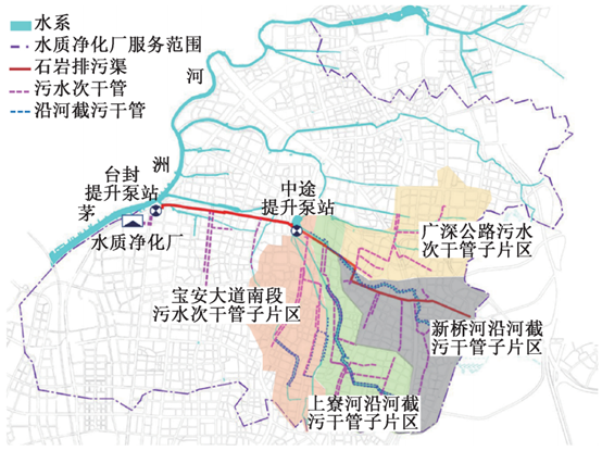 某污水收集片区位于茅洲河流域下游,总服务面积22.4 km2,服务人口约35万人,区域内工业企业众多,部分河道受珠江口潮汐作用,属于感潮河段。经过近年的雨污分流管网工程建设,片区内基本形成了分流制排水体制。污水通过2个次干管收集子片区和2个沿河截污管子片区收集,输送至石岩污水干管,利用中途污水提升泵站转输,然后连同其他片区污水输送至末端水质净化厂处理。
