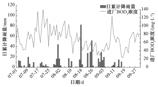 图3 末端水质净化厂雨季进厂BOD5浓度与日累积降雨量关系