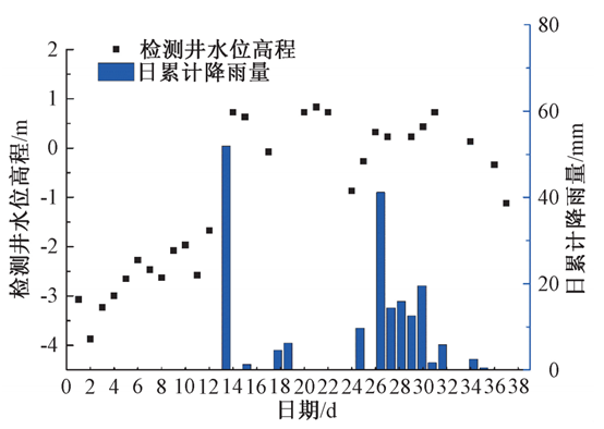 为评估石岩排污渠的雨水侵入情况,2019年2至3月期间对石岩排污渠在中途泵站前的检查井进行水位持续监测,分析检查井水位与雨水侵入关系。如图4所示,检查井水位变化与日累计降雨量显著相关,存在雨水侵入污水系统情况。