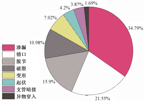 借助CCTV检测技术,在水质净化厂收水管网共发现存在结构性缺陷的管段12.5 km,共1 239处,片区范围内的污水管普遍存在渗漏、破裂、脱节、错口等结构性缺陷,见图5。参照《城镇排水管道检测与评估技术规程》分类,一级缺陷占36.8%,其中渗漏、脱节和错口是发现的主要问题。