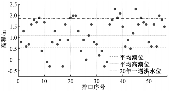 由于本片区属于珠江口河道感潮区域,而沿河截污系统与片区内河道排口连通,存在河(潮)水倒灌风险。通过水文数据与管网设计资料核查(见图6),片区内某感潮河道的河底高程在-2.6~-0.1 m,调查其沿河排口并分析潮位后发现,在平均潮位线以下的排口有11个,占19.6%,其中沿河截污溢流排口7个;而20年一遇洪水位以下的排口达到82.1%。对片区内所有排口进行梳理,共找出存在高潮位下倒灌风险的排口83处。