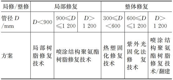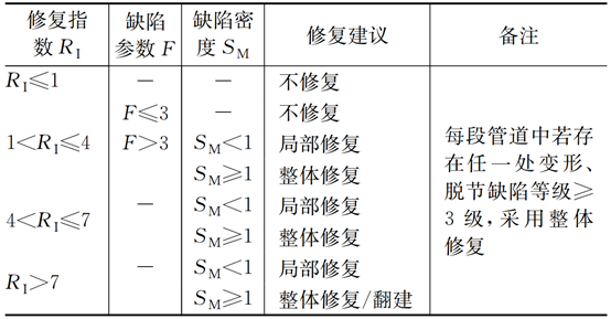 按照《城镇排水管道检测与评估技术规程》规定的参数技术方法,按以下标准确定修复范围及方法。