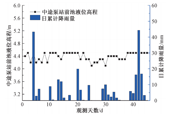 图7 对 策实施后中途泵站前池水位与日降雨量对比