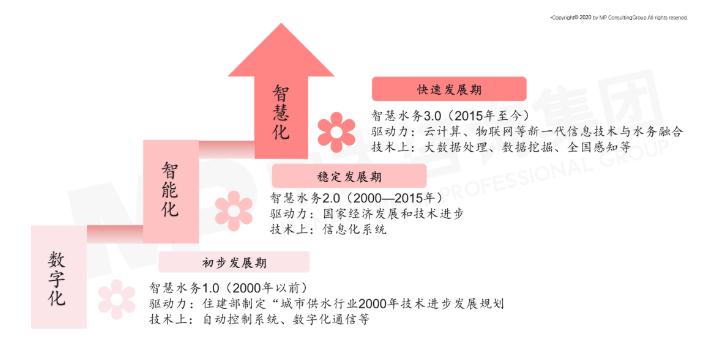 大体来看我国智慧水务技术背景发展主要分三个阶段,从1.0初步发展期到2.0稳定发展期再到3.0快速发展期,经历了数字化-智能化-智慧化的蜕变,在技术和驱动力等方面也实现突飞猛进式的发展。