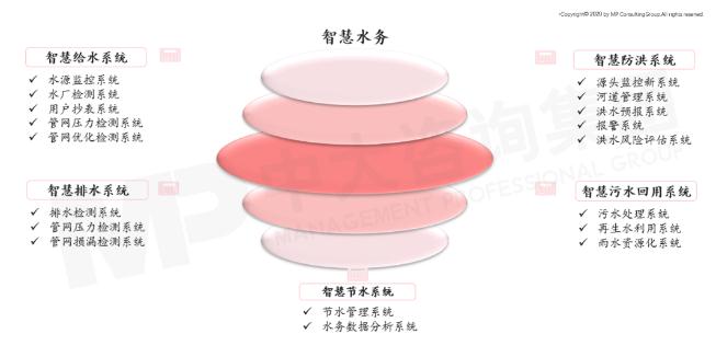 系统构成:智慧水务系统由智慧给水系统、智慧排水系统、智慧防洪系统、智慧污水回用系统、智慧节水系统等子系统构成,同时每个子系统又有如水源监控系统等众多的子系统,共同构成智慧水务这个大系统。