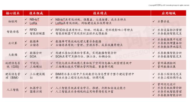 智慧水务核心技术包括物联网、智能传感、云计算、大数据、人工智能等。各项核心技术运用于智慧抄表、管网优化设计等业务领域,能够显著提升水务管理及运营效率。