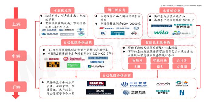 智慧水务产业链包括上游的水表供应商、阀门供应商、水泵供应商,分别为下游的系统集成服务商提供水表、阀门、水泵等硬件设备;中游的自动化方案服务商、智能技术服务商,为下游的系统集成服务商提供设备自动化解决方案,下游的系统集成服务商,提供物联网、智能传感、云计算、大数据、地理信息系统(GIS)、建筑信息管理(BIM)、人工智能等技术服务,为最终用户提供智慧水务应用服务。