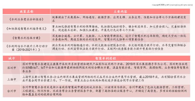 自2015年“水十条”发布以来,水利部门先后印发多项政策,意在推动水务工作智慧化进程,各地积极相应,如火如荼地推进智慧水务建设进程,其中,深圳市建设重点集中在软件管理系统和硬件产品运用;上海市实行合同节水管理;浙江台州市的智慧水务项目成为省内典范。