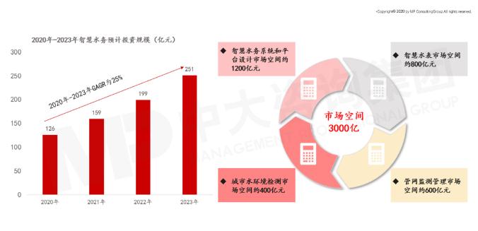 据不完全统计,截至2020年6月,我国新注册成立在业水务公司37600家,智慧水务的水务公司潜在客户市场大,未来有很大的开拓空间。中国水务市场规模从2014年的65.6亿元增长至2018年的86亿元,年复合增长率达7.0%。近期来看,有关机构预测智慧水务市场规模将进一步扩大,预计至2023年,中国智慧水务市场规模将达到251亿元,远期来看,智慧水务市场空间充足,可达3000亿元,市场空间提升广阔。