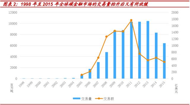 从国外经验看,碳金融市场已经成功实现了对碳排放这一类环境成本的 科学量化和市场化定价,并为其提供了流转、估值和变现的便捷渠道将 其所对应的风险成本或潜在收益转化成了企业的财务绩效,成为绿色金 融体系中率先实现落地生根的环节。1998 年至 2015 年全球碳金融市场 的交易量抬升后又有所放缓,我们预计,中国参与至碳中和阵营中后, 全球碳中和共识下,碳交易市场发展或迎来共振,碳金融市场规模或再次攀升。