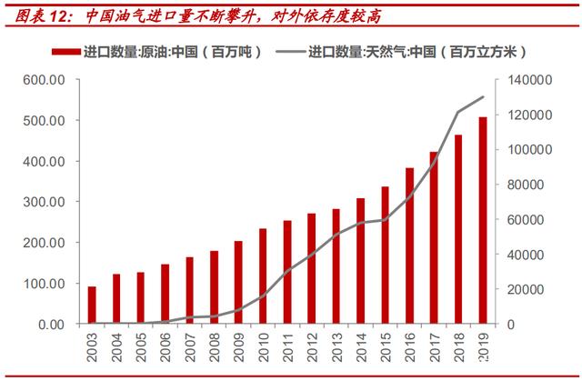 从进口细分数据看,石油、天然气等能源进口量占整体进口量的13.28%, 仅次于芯片等关键技术部件,矿产占比达到 9%。作为我国制造业的“血 液”,近年来,我国这两项进口的需求和对外依存度呈增加趋势:2019 年,原油进口达 5.1 亿吨,增长 9.5%,对外依存度升至 72.45%,天然 气进口 9656 万吨,增长 6.9%,对外依存度为 44%,油气主要进口国为 美俄、沙特等中东国家。根据 IRENA 数据,2019 年中国陆上风电、太 阳能光伏、水电累计装机规模分别占全球总量的 34%、35%、27%,碳 中和目标路径下,新旧能源结构的转变有助于提升中国国内大循环下的 供给侧的上游资源可控。