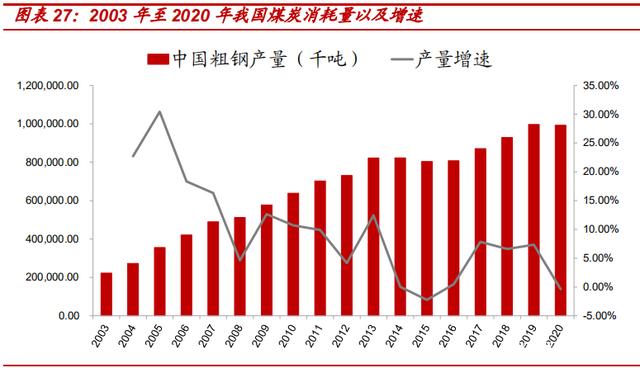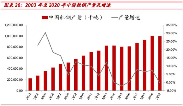 我国钢铁铁行业碳排放量占全国碳排放总量的 15%,是碳排放最高的制造业。粗钢作为传统钢炼产能主体,在我国产量居高不下,我国粗钢产 量从 1949 年的 15.6 万吨,仅占全球产量的 0.1%,而 2020 年我国粗钢 产量为 10.53 亿吨,占比全球 53.3%。从增幅方面来开17 年来我国粗 钢产量增速已经开始走低,为后期粗钢等低质高碳排钢材的退出作出铺 垫,但短期粗钢等仍是我国钢铁行业产能主流。