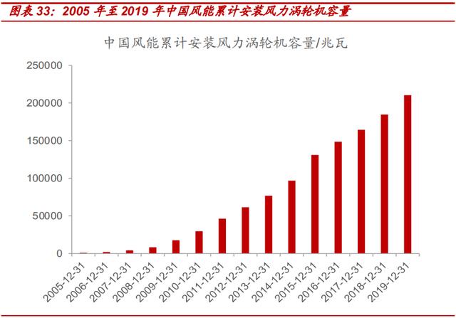 纵向对比,中国累计安装风力涡轮机容量在 2019 年约 210478 兆瓦, 同比 2012 年增长了 241.7%。同时中国风电累计装机容量也持续稳定增 长超过十年,截至 2019 年 12 月 31 日已达到 236402 兆瓦,与 2012 年相比同比增长 213.85%。横向对比,2019 年中国风能消耗达到 3.62 百亿亿焦耳,远超于美德英法等欧美发达国家,该数值占据全球总风能 消耗量的 28%。截至 2019 年,中国可再生能源发电总装机容量 7.9 亿 千瓦,约占全球可再生能源发电总装机的 30%。其中,水电、风电、光 伏发电、生物质发电装机容量分别达 3.56 亿千瓦、2.1 亿千瓦、2.04 亿 千瓦、2369 万千瓦,均位居世界首位。