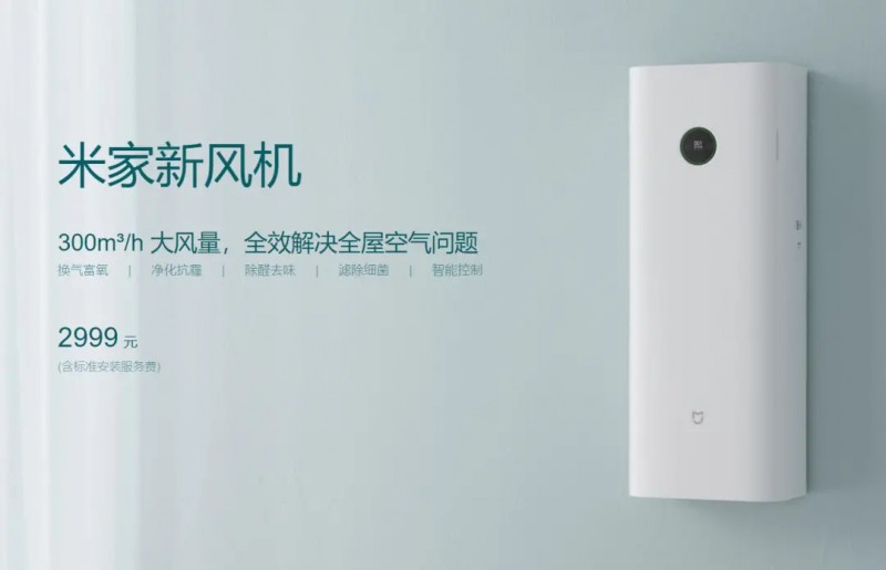 米家在制冷制热之外增加新风功能,使得空调能够在本身的室内空调冷热循环基础上,也可以独立与室外进行空气交换。新风风量可达60m³/h,官方产品页面宣称42分钟完成2.8米高的15平方房间换气,米家还添加了温度面板外的第二块面板,用于专门监控室内二氧化碳浓度。