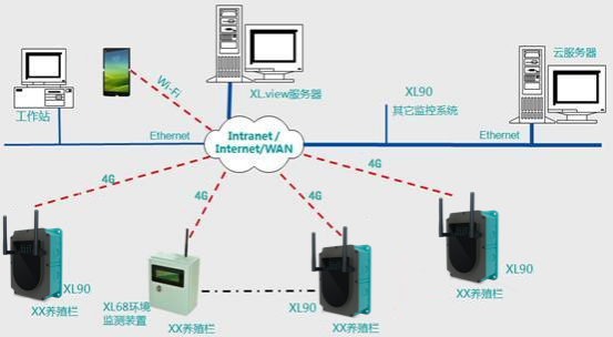 XL68智能环境监测终端(装置),采集空气温湿度、H S、NH 、O 、CO 等等气体浓度,光照、差压等等信号;简单应用中选择XL51温湿度传感器采集空气温湿度;XL60无线采集装置控制养殖栏内的参数,起动风机.html'>风机、加热装置、湿帘、照明,起动声光报警器,采集用水量、用电量、水压等等用户关注的参数。