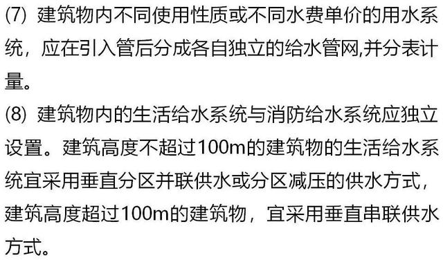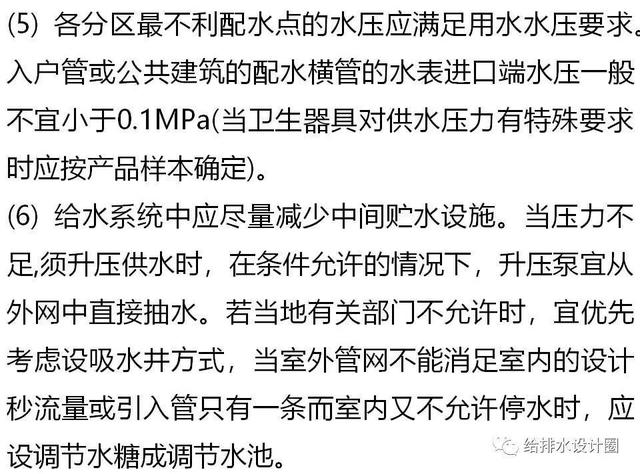 (3) 供水应安全可靠、管理维修方便 。 给水系统供水压力首先应清足不损坏给水配件的要求,一般卫生器具配水点的静压不得大于0.6MPa,各分区最低卫生器具配水点处静水压不大于0.45MPa;水压大于0.35MPa的进户管,应设減压或调压设施。