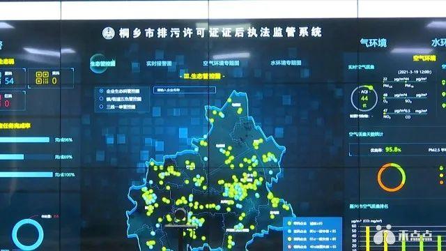 在嘉兴市生态环境局桐乡分局的指挥大厅,电子大屏中展示着桐乡市排污许可证证后监管系统,通过这些大数据,工作人员可以进行实时地监管,及时地处置,进行环保督查的全过程在线监管。排污许可证证后执法监管系统,落实了企业自查、属地巡查、执法监察的“三级巡查”管控,目前,已获得有效预警信息6.63万余条,帮助125家企业避免了环境问题发生,企业完成整改率96%。