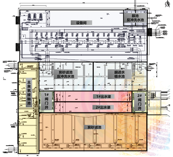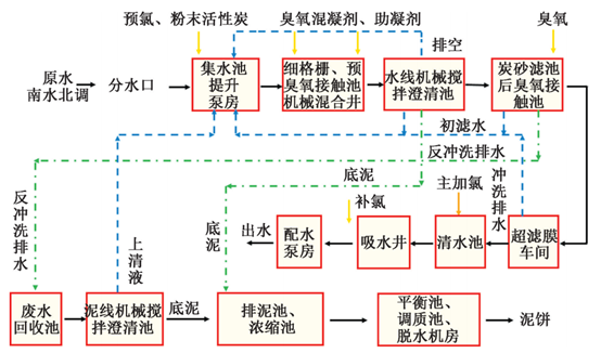 净水厂工艺主线采用预处理+强化常规处理+臭氧氧化+炭砂滤池+超滤膜+次氯酸钠消毒工艺,为满足应急需求,设置粉末活性炭、预留酸碱中和投加等应急处理设施。