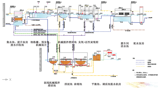 水厂平面布置中,将相对较高的水线机械搅拌澄清、炭砂滤池、膜车间等车间尽量靠山一侧布置,调整屋顶坡度,可减少路边视觉对山体的遮挡。本项目的半地下下沉式布置方案是将水线机械搅拌澄清池的池顶走道板与厂平面基准标高持平,流程如图2所示。