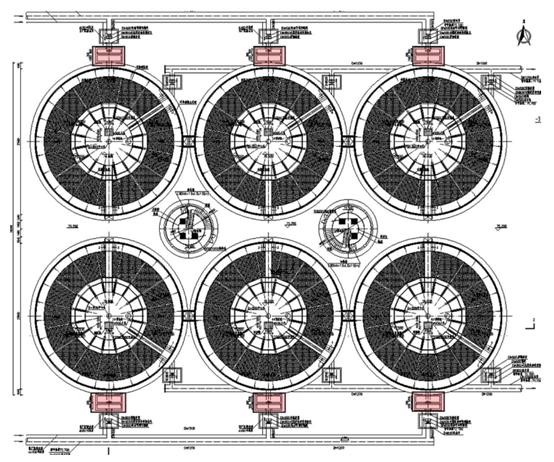 (3)设计参数。分2个系列,每个系列3座池体,东西向两排机加池间距5 m,设置2座配泥井。设置6座单池,直径D=25 m,清水区设置斜管,上升流速1 mm/s。