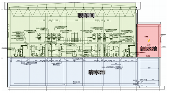 (1)布置方式。清水池叠合压力式超滤膜车间布置,压力式超滤膜车间的管廊层位于南侧清水池上部,膜堆层位于管廊层上方(首层,见图6)。清水池导流墙采用钢筋混凝土材质,充分考虑上部膜车间设备荷载,L/W布置结合超滤膜车间柱网间距布置。