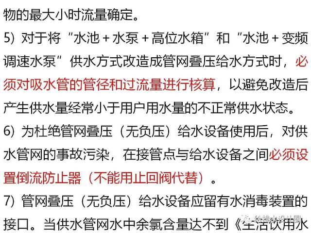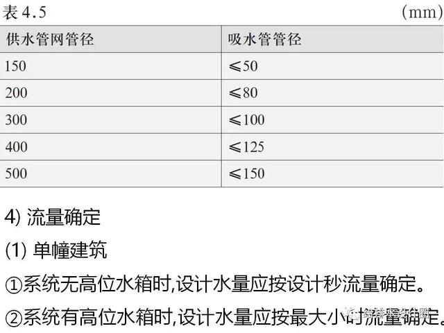 3)管网叠压(无负压)给水设备的吸水管的管径宜比供水管至少小两级或两级以下,(树上鸟教育给排水设计杨老师)或不大于供水管管径的 1/3。也可参考表 4.5 确定。