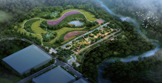 龙洞堡下沉式再生水厂采用下沉式的建设形式,水处理构筑物单元位于地下箱体内,地下箱体顶部覆土1.5 m,其上打造生态景观公园,其地上部分鸟瞰如图1所示。