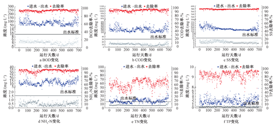 本项目自投入运行以来,各项指标均稳定达到设计要求,并对2017年至2019年全年进出水水质数据进行了分析,如图4所示。虽然进水水质波动较大,但出水水质均能稳定达标排放。