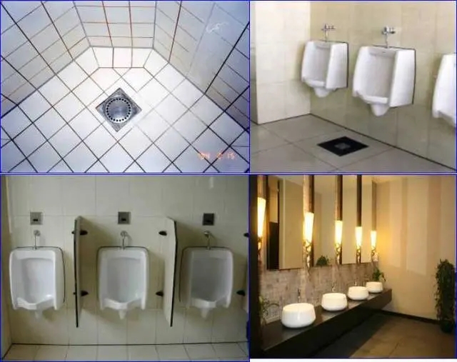 地漏居中,墙面砖与地砖对缝打胶。小便斗与墙面砖打胶均匀