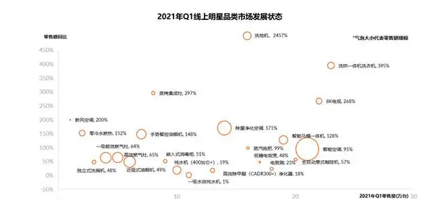 疫情之后,家电市场凛冬已过,时至四月家电市场已是一片欣欣向荣景象,中怡康测算数据显示,2021年第一季度中国家电市场规模达1903亿元,同比增速高达47%,双线市场均呈现高速增长态势。