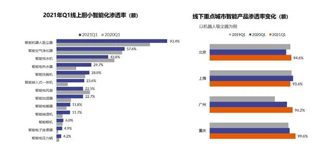 厨小电领域在智能化方面环境电器走在最前端,最具代表性的有机器人吸尘器、空气净化器、纯水机,到2021年一季度,线上市场中智能机器人吸尘器、智能空气净化器、智能纯水机的市场占比分别达93%、58%、44% 。