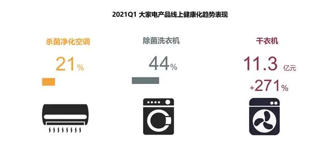 就大家电产品而言,空调可以通过高温自清洁、杀菌净化、除甲醛等功能帮助人们守护所处环境。截至3月,杀菌净化空调在线下市场已占到21%零售额份额;洗衣机可以高温除菌、蒸汽除菌达到呵护贴身衣物、床褥的效果,一季度线下除菌洗衣机零售额份额已达44%,而干衣机本身具备高温除菌除螨的特点,当下处于规模上升通道,一季度11.3亿元,同比增长271%;不同品牌冰箱推出全空间保鲜、MSA控氧保鲜技术、微晶一周鲜、真空保鲜、WILL保鲜等功能,保证入口食材安全。