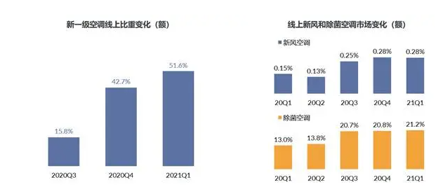 如果说节能省电是消费者对空调产品的普遍性需求,那健康、新风则是改善需求的主要关注功能。据用户调研显示,76.2%的高端用户认为高端空调的健康功能是必备的,26.6%的高端用户认为高端空调的新风功能是必备的。由于健康性产品布局市场较久,除菌空调在线上已经走上高速成长之路。而新风空调问世时间虽然较短,但伴随厂家的宣传和用户培育,以及品牌提供越来越多的亲民价格的新风空调产品,预判2021年新风空调市场将继续爆发。