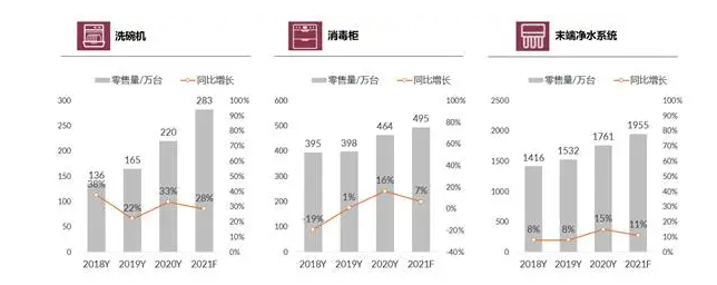 疫情下健康概念受热捧,与健康紧密相关的厨卫品类关注度上升。中怡康的数据显示,2020年洗碗机市场零售量220万台,同比增长率到了33%,预计2021年持续增长,销售量283万台,增长率仍然保持两位数;一度被认为受到了洗碗机和集成灶强烈挤压的消毒柜,受益于疫情,2020年消毒柜产品销售464万台,增长率达到了16%,2021年预计销售495万台,增长率在7%左右。另外,随着近几年经济的快速发展,水资源污染问题引起的疾病事件也时有发生,人们対健康饮水的问题也越来越关注。疫情也让净水系统再次成为焦点。2020年末端净水系统零售量基准增长到了15%,预计在2021年零售量将达到1955万台,保持11%的增长。