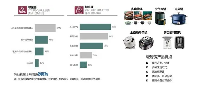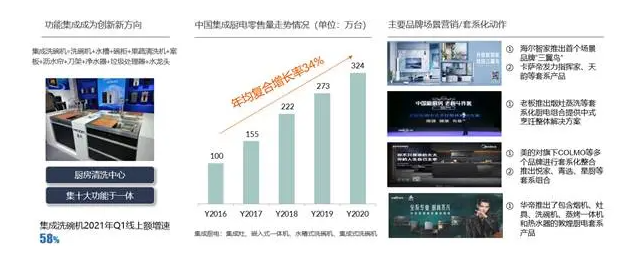 另外,越来越多的家电产品在功能上进行集成,比如,方太旗下的米博推出的多功能烹饪机、老板电器子品牌大厨推出的台式蒸烤炸一体机和蒸煎炖煮一体机、摩飞的多功能料理锅等等,以集成洗碗机为例,集成了洗碗机、水槽、碗柜等十大功能于一体,2021Q1线上额增速达58%。