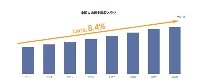 随着中国经济的快速发展,中国居民收入水平快速提升,2020年全国居民人均可支配收入32189元,近八年的复合增长率为8.4%。居民收入持续快速提高,为换新消费提供强大的经济基础。