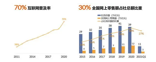 互联网、移动互联网在中国已经高度发达,互联网普及率超过70%,移动互联网网民规模近10亿。电商在中国经过10多年的发展,电商的生态已经发展的非常成熟,商品非常的丰富、支付非常的便利、物流非常的快速,这些非常便利的购物体验吸引了越来越多的消费者转向线上购物,网上购物已经成为了中国广大消费者非常普遍的日常行为。2020年,因新冠疫情防控的需要,线下购物非常不方便,更多的消费者和更多的需求通过线上来满足。因此,2020年线上零售额占社会消费品零售总额比重达到30%。尽管2021年Q1这个占比有所回落,但这是暂时的,线上购物给消费者带来的卓越体验只会让更多的消费者、更多的消费行为转到线上,未来这个占比依然会继续上升。