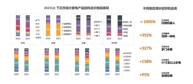 下沉市场家电产品升级明显,再叠加原材料价格上涨等因素,整体均价体现出清晰的上行趋势,大家电6000元以上市场份额在30%左右,价格结构得到很大改善,而与全市场相比,仍有一定的上升空间。