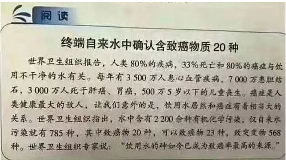 当下这个水污染依然存在的情况下,不要轻视净水与健康的关系!湘教版《生态文明教育》中介绍道:终端自来水中