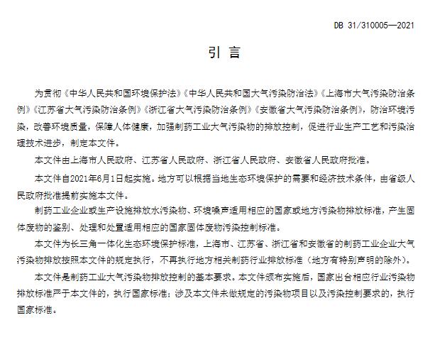 日前,上海发布地方标准《制药工业大气污染物排放标准》(DB31/310005-2021)。标准于2021年6月1日实施。详情如下: