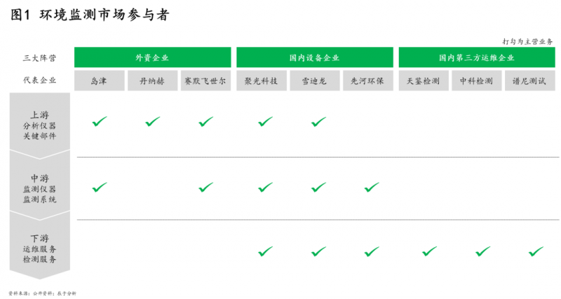 当前环境监测行业主要分为三大阵营,分别是外资企业、国内设备企业及国内第三方运维企业(如图1)。外资企业的业务重心在上游,包括监测所用到的分析仪器、监测仪器的关键部件等;国内设备企业的业务重心在中游,包括集成化的监测仪器、监测系统等,但领先企业正逐渐向上下游延伸,提供全产业链服务;国内第三方运维企业监测业务规模较小,主要是下游的仪器运维及污染物检测服务。