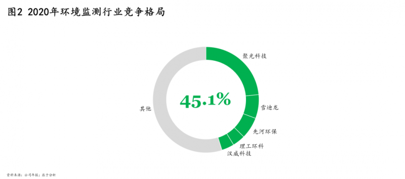 过去几年内,国内设备企业强势扩张,市场份额持续提升。外资企业虽有技术优势,但由于我国对相关设备国产化的支持,加之国内企业自身的技术进步,优势不断下滑。可以看到,为加快环境监测设备国产化步伐,国家出台多项政策,如《空气质量新标准第二阶段监测实施方案》、《生态环境监测网络建设方案》等,鼓励国内科研部门和相关企业研发具有自主知识产权的环境监测仪器设备,规定政府在满足需求的条件下优先使用国产设备。第三方运维企业以小规模居多,受数据造假、运维不规范、信任危机等一系列问题影响,部分被淘汰出局。截至2020年,我国环境监测CR5为45.1%(如图2),行业集中度较高。