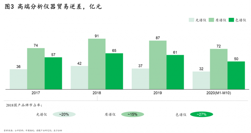 其一,自动监测对仪器设备提出了更高的要求,手握高端产品的外资企业重获竞争力。当前我国高端分析仪器仍依赖进口,近两年来贸易逆差虽有所降低,但依然存在数十亿的差距(如图3)。2018年,光谱仪、质谱仪、色谱仪的国产品牌市占率约为20%、15%、27%,差距仍然较大。