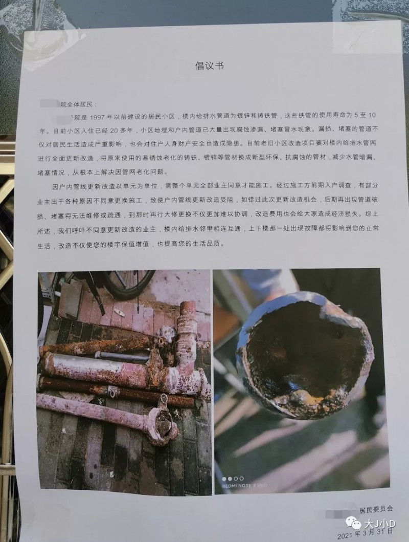 看她给我发过来的小区公告都吓人,但因为楼上几户邻居都刚装修过,都不愿意动,导致整个单元自来水管道都换不了,其他几个单元也吵来吵去,最后警察来了也没换成。
