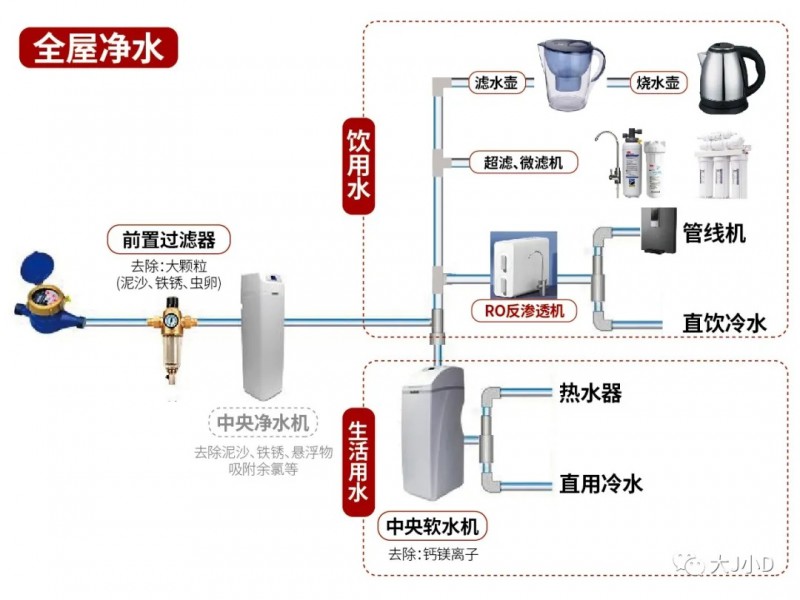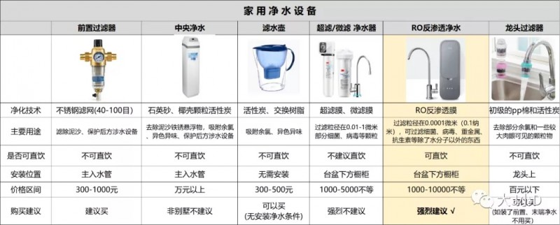 有安装条件家庭:前置过滤器(可装可不装)+RO反渗透净水器(重中之重);
