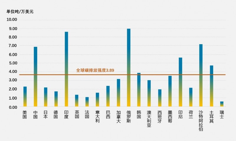 2019年全球GDP前20名国家的碳排放强度城PLUS重绘